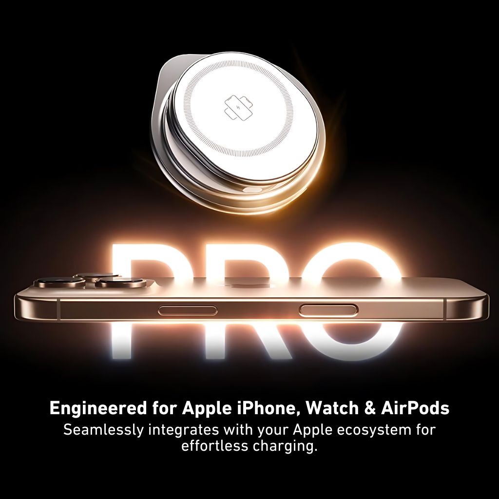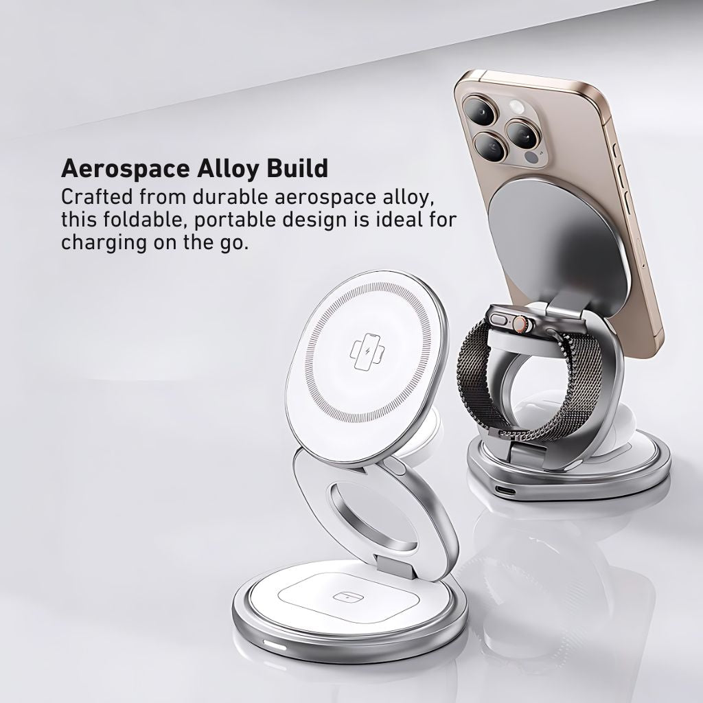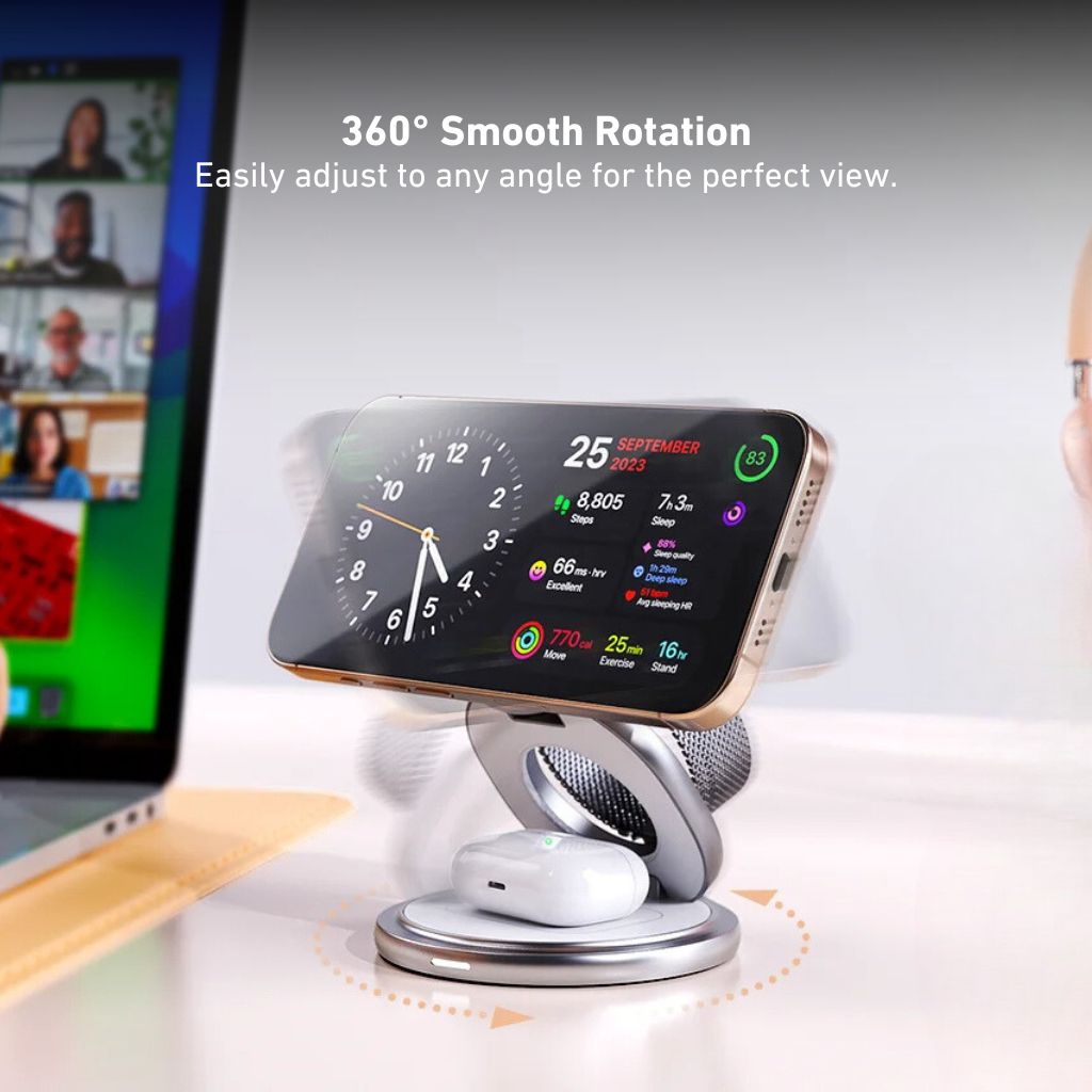 Experience on-the-go charging convenience with the Evolved Chargers 3 in 1 Rotating Foldable Travel Charger. This compact device allows you to fast-charge your Apple iPhone, Apple Watch, and AirPods simultaneously, ensuring a clutter-free experience. Its foldable design enables easy portability, fitting right into your pocket and offering future-ready charging wherever and whenever you need it.