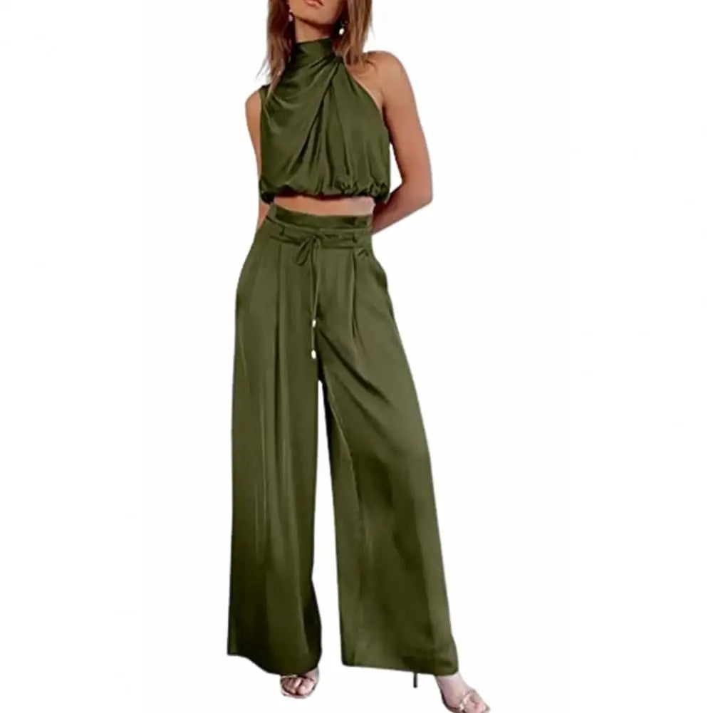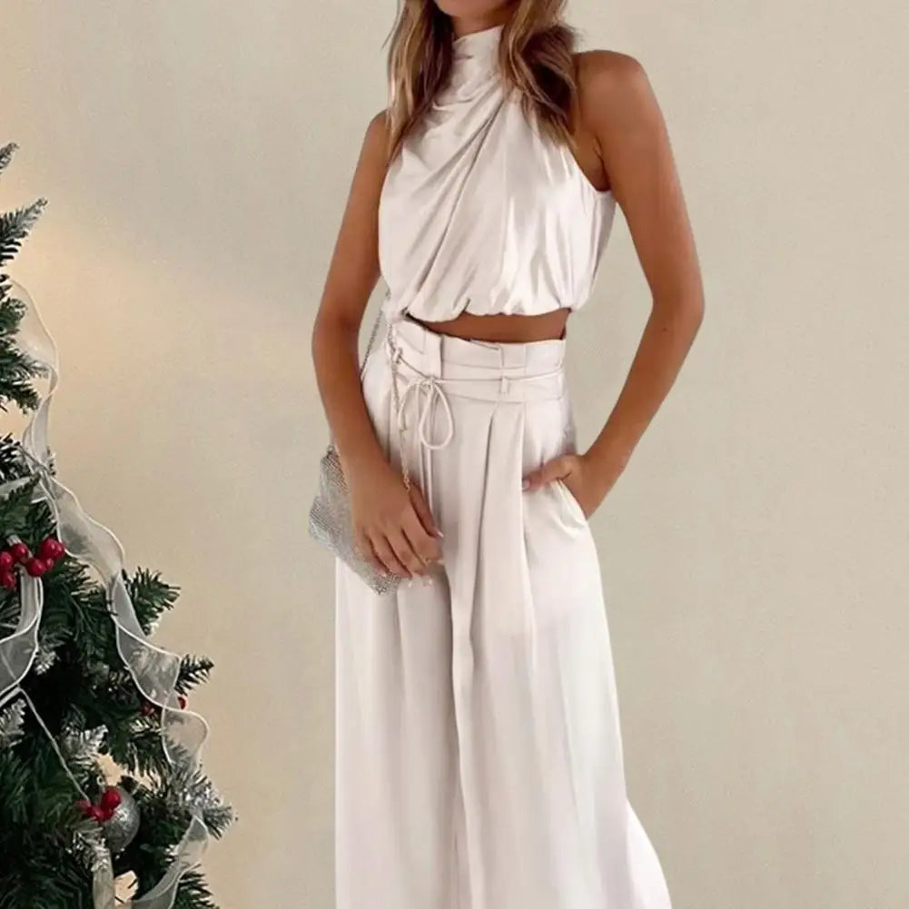 1 x Silky Pleated Two-Piece Set – Sleeveless Top & Wide-Leg Pants for Effortless Elegance