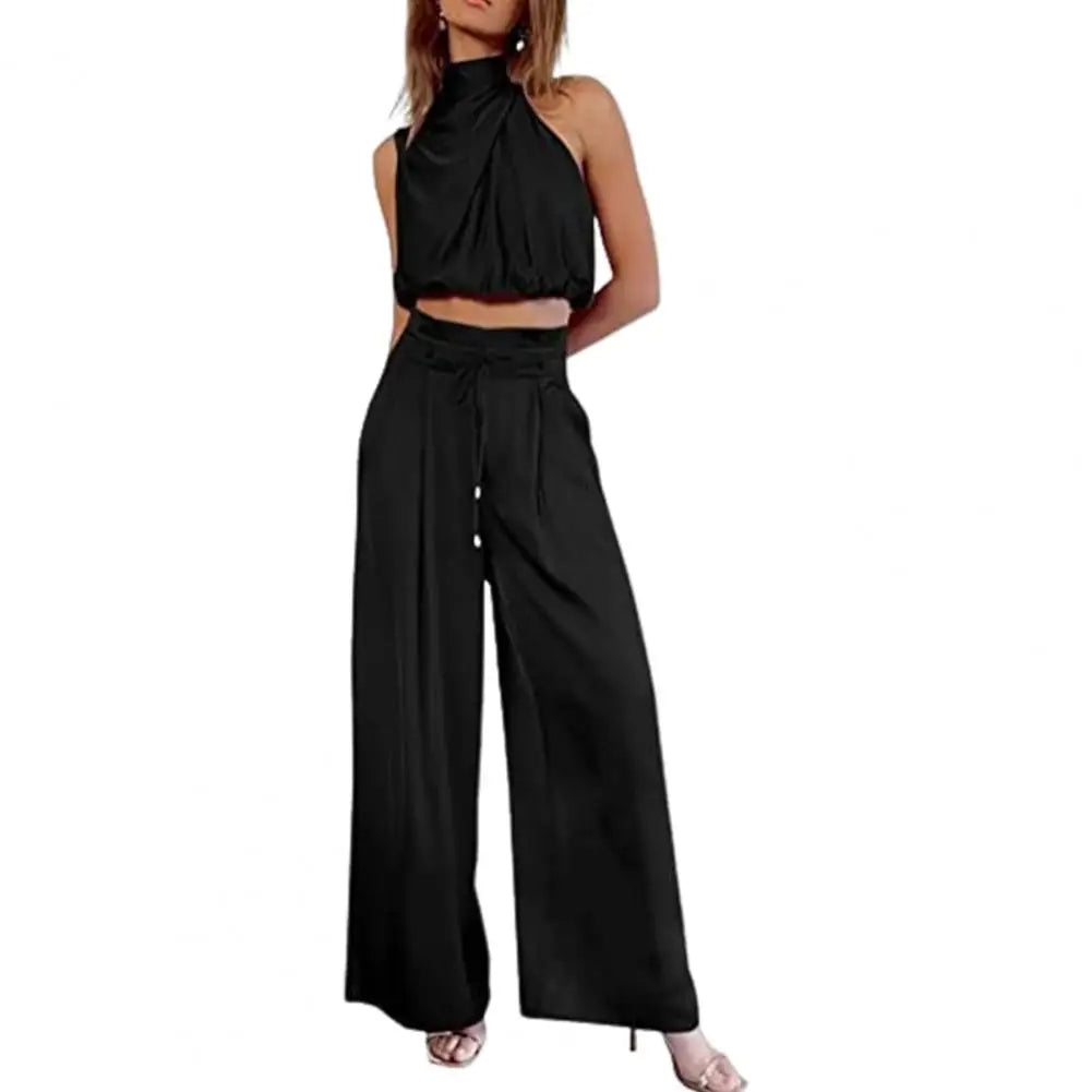 Featuring a sleeveless turtleneck crop top paired with wide-leg pants, this set creates an elongated, balanced effect. The relaxed fit enhances your natural shape while providing ease of movement, making it perfect for both casual and dressy occasions.