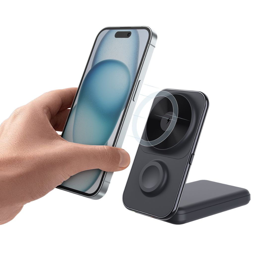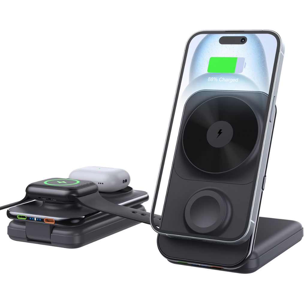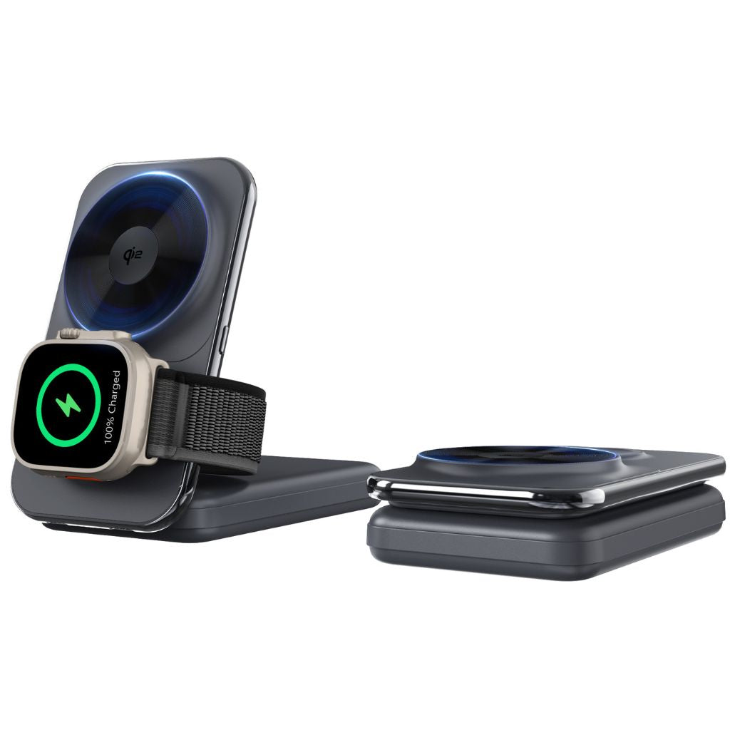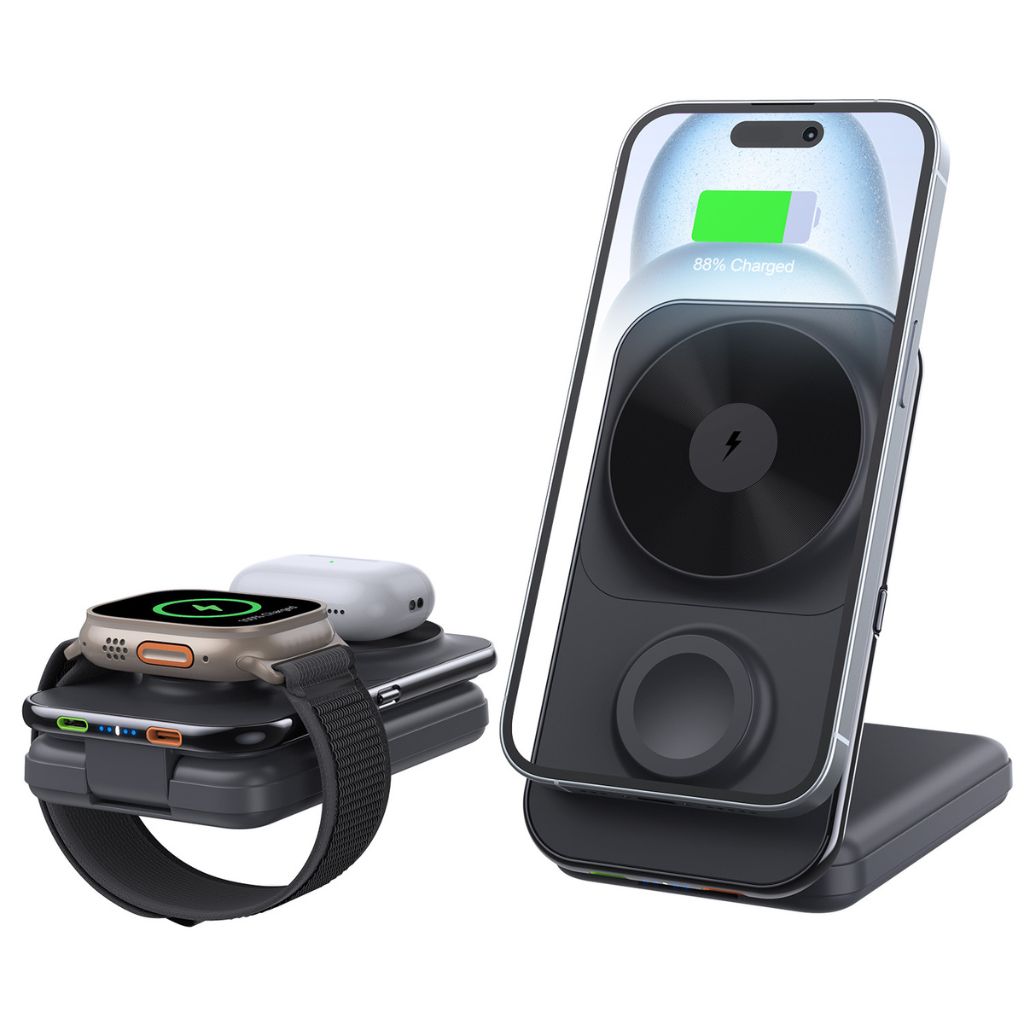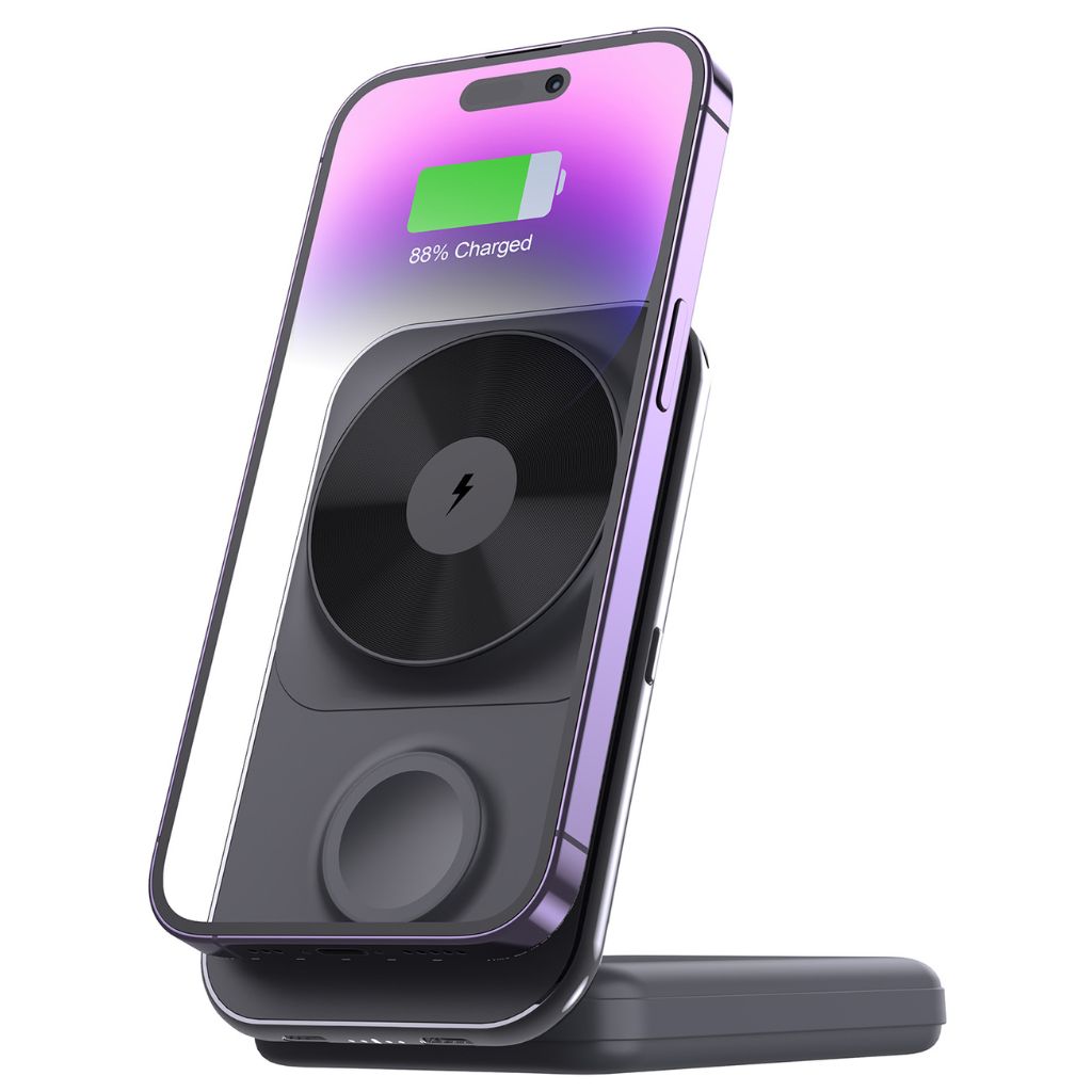 The 3-in-1 Power Bank with Qi2 and MagSafe technology: a wireless magnetic charger for Apple iPhone 16 Pro Max, Apple Watch Ultra, and AirPods Pro. Charge three devices simultaneously with fast 15W charging and an 8000mAh battery. Enjoy a case-friendly, foldable design, overcharge protection, and seamless home, office, or travel charging. Perfect for all your Apple devices.