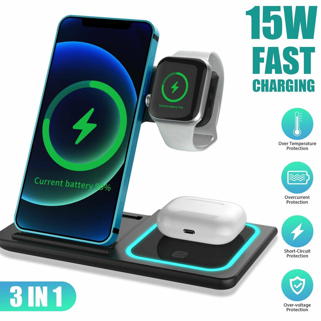 • 3 in 1 Wireless Charger: The wireless charger can charge for mobile phone, apple watch, and Airpods. It's suitable for Apple AirPods 1/2/AirPods Pro Galaxy buds,Apple Watch Series 8/7/6/5/4/3 and iPhone 14 iPhone 14 Pro iPhone 14 Pro Max iPhone 14 Plus / iPhone 13 / 13 Pro / 13 Pro Max/iPhone 12 / 12 Pro / 12 Pro Max/ 11 / 11 Pro / 11 Pro Max / XS Max / XS / XR / X / 8 / 8 Plus and Samsung Galaxy and more.