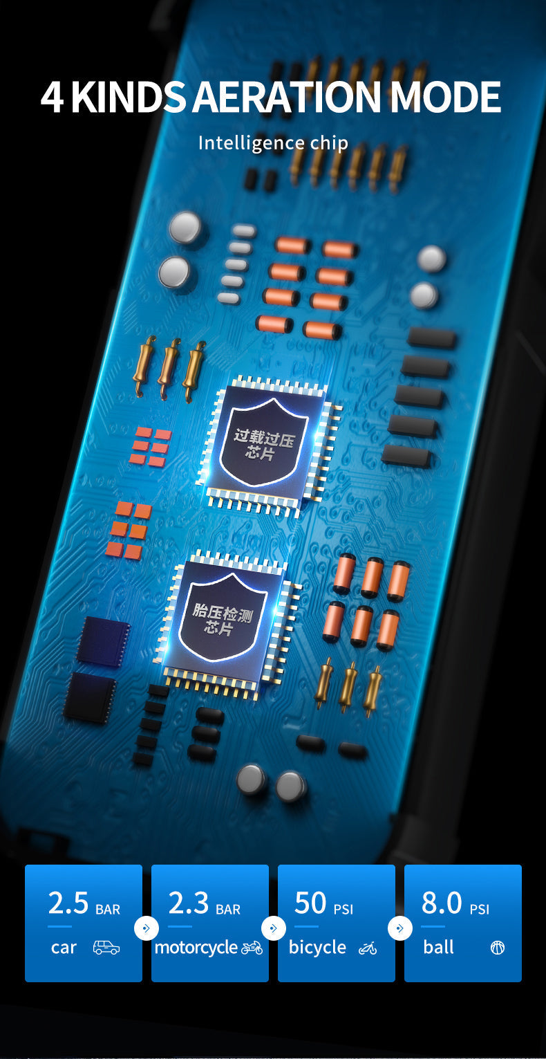 Smart Inflator with LCD ScreenSmart preset & auto shut-off without repeated adjustment and check. With unique turbocharged 40L/Min (150 PSI) lasting 25 minutes. The portable car jump starter with air compressor quickly inflates a car tire to 20 PSI in just 2 minutes, 3 different nozzles for inflating cars, bikes, balls, etc. Large LCD display to read real-time data, 3 optional unit switching and detachable extended air hose for ease of use