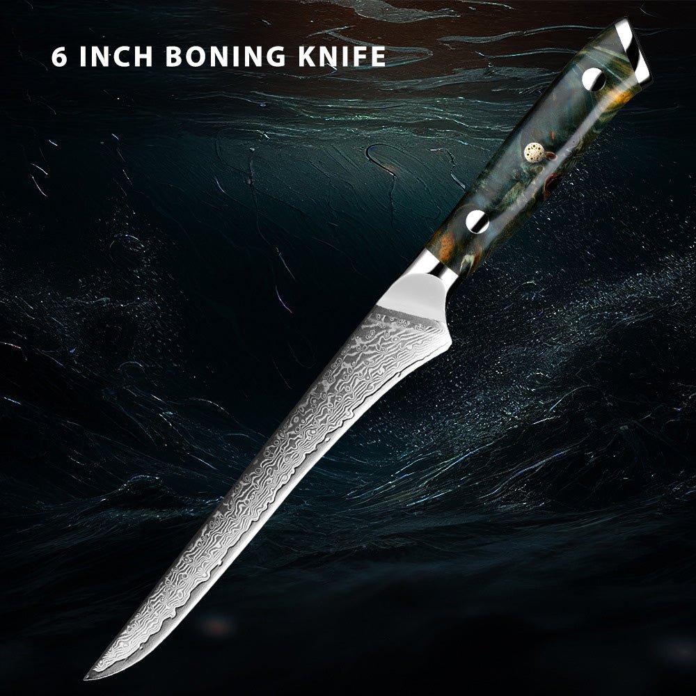 This professional Japanese knife set includes a Chef's Knife, Nakiri Knife, Japanese Santoku Knife, Boning Knife, Steak Knife, Paring Knife and Peeling Knife, offering a versatile solution for mincing, chopping, slicing, and cleaving meats, bones, steaks, fish, vegetables, and fruits.