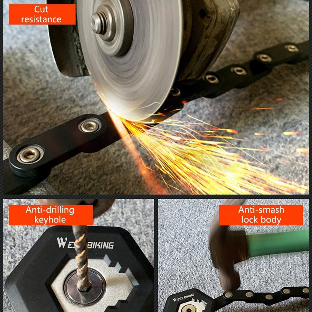 • LAYERED COVER - The chain is covered with waterproof & dust-proof ABS rubber paint, which can protect it from rust, oxidation, corrosion. It significantly improves the life of the lock and prevents it from damaging the bicycle frame.