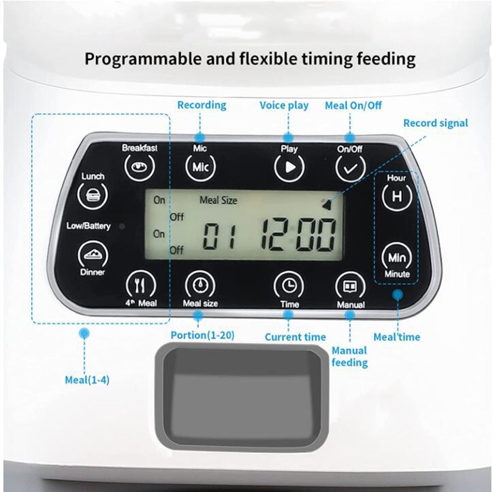 • Voice Recording Remind - With a voice recorder and speaker, this feeder can record your voice for 12 seconds to call your puppy or kitty for meals. Your personal sound will keep your pet not alone and not miss the meal when the food is ready.