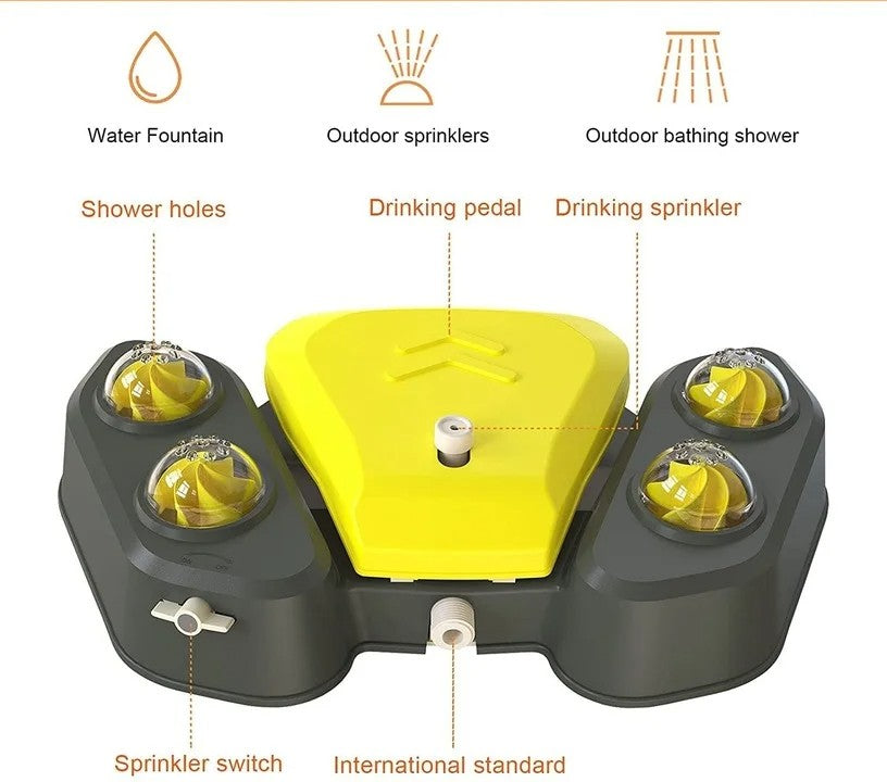 This clever toy functions as a pedal-activated waterer, shower, and sprinkler—all in one! With a quick turn of the back switch, water sprays from four adjustable shower holes, transforming your yard into a cool splash zone or outdoor bath. It features a rotary dial to control water flow and is compatible with standard hose connectors, making setup a breeze and playtime even better.