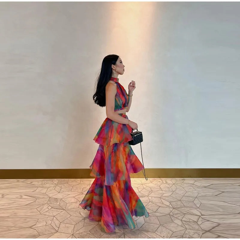 Bold Contrast Tie Dye Deep V-Neck Strap Dress – Backless Off-Shoulder Design for Spring Parties and Holidays