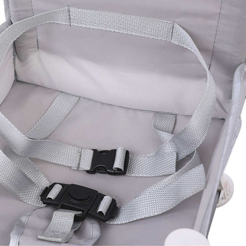 • The baby seat is equipped with a five-point safety belt and strap that can be attached to the chair to prevent serious injury from falling/sliding out.