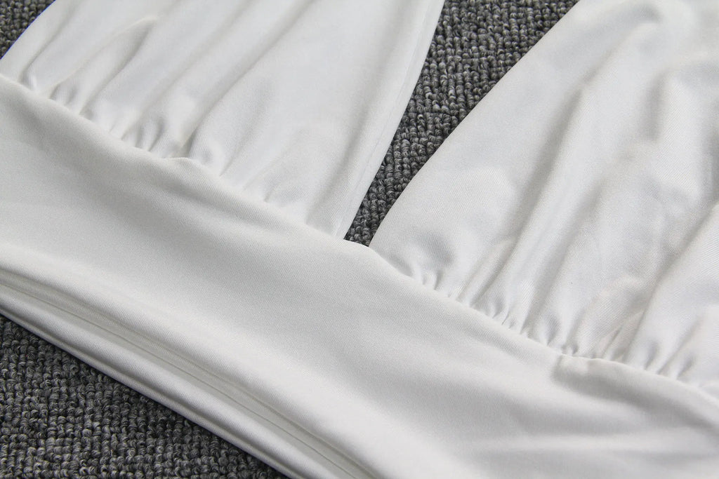 With a deep V-neck crop top and hollow-out details, this outfit strikes the perfect balance between elegance and sensuality. The delicate ruffle straps add a playful touch, while the sleek bodycon skirt keeps the look refined and sophisticated. It’s a must-have ensemble for those who love to make an entrance.